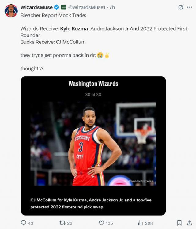 美媒BR最近兩天模擬了兩套庫茲馬的交易方案。一套是與奇才交易,雄鹿送出庫茲馬、安德森 - 杰克遜、2032年受保護首輪簽,從奇才換到麥科勒姆。