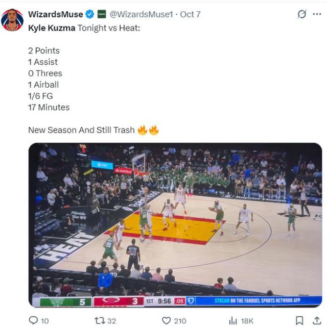 10月7日的季前賽首秀,庫茲馬6投1中,還貢獻了三不沾,17分鐘里只得到2分,在場上的表現(xiàn)十分無力。