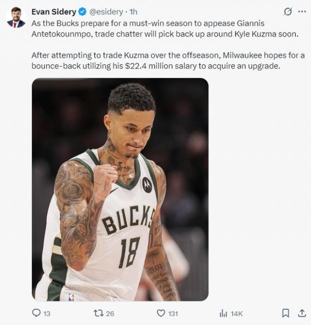 北京時間10月10日,據(jù)NBA記者埃文 - 斯迪瑞報道,為確保球隊用一場關鍵勝利安撫揚尼斯的情緒,關于庫茲馬的交易緋聞會再度興起。實際上,在休賽期雄鹿就試圖將庫茲馬交易出去,可惜未能成行。如今,雄鹿希望借助庫茲馬2240萬的薪水達成一筆交易,實現(xiàn)陣容升級。也就是說,不到8個月,雄鹿管理層就承認換來庫茲馬是個天大的錯誤。