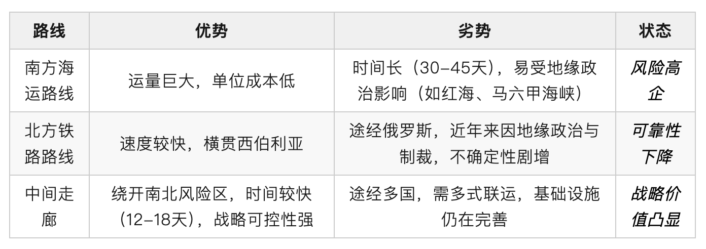 近年來,當南方的“海上咽喉”與北方的“陸地通道”同時面臨挑戰(zhàn)時,所有人的目光都投向了第三條路——中間走廊 (Middle Corridor)。