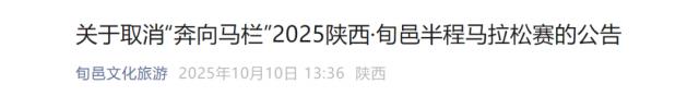 旬邑文化旅游公眾號發(fā)布了《關(guān)于取消“奔向馬欄”2025陜西·旬邑半程馬拉松賽的公告》。