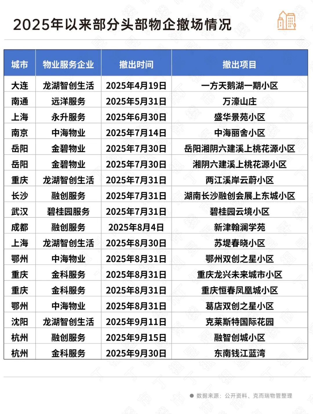 據(jù)克而瑞物管統(tǒng)計(jì),2025年物業(yè)企業(yè)主動(dòng)退出項(xiàng)目的現(xiàn)象顯著增多,僅7 - 8月,公開(kāi)披露主動(dòng)撤場(chǎng)的項(xiàng)目已近50個(gè),龍湖智創(chuàng)生活、中海物業(yè)、碧桂園服務(wù)等頭部物企也在其中。