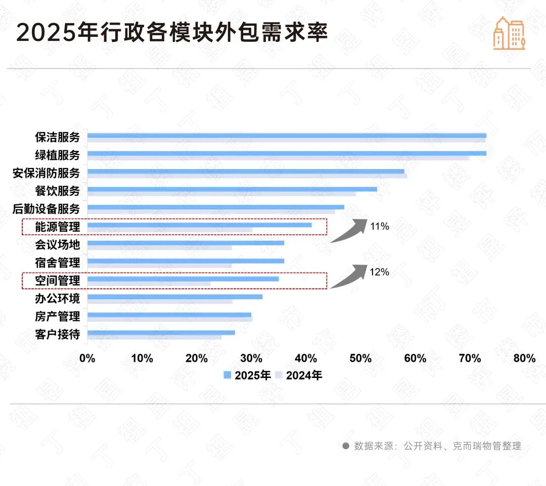盡管企業(yè)經(jīng)營(yíng)壓力持續(xù)傳導(dǎo),但空間管理和能源管理仍呈現(xiàn)結(jié)構(gòu)性機(jī)遇。調(diào)研數(shù)據(jù)顯示,在2025年的行政各模塊外包需求中,能源管理和空間管理的增長(zhǎng)幅度最為顯著,分別達(dá)到了11%和12%。從百?gòu)?qiáng)物業(yè)服務(wù)企業(yè)的布局情況來(lái)看,超過(guò)30%的企業(yè)已經(jīng)在能源管理和空間管理業(yè)務(wù)上進(jìn)行了深度布局。