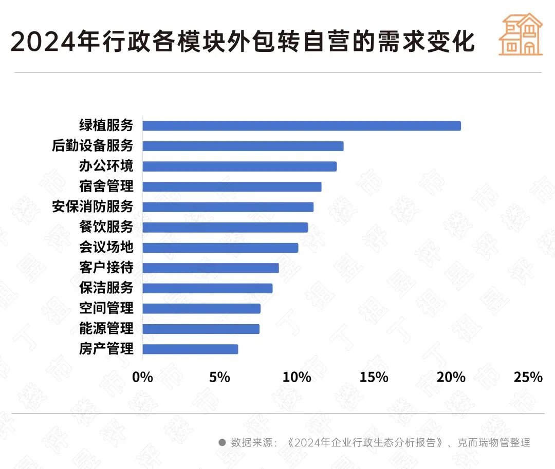 甲方壓力向后端傳導(dǎo),部分企業(yè)為降本推動(dòng)外包轉(zhuǎn)自營(yíng)。據(jù)克而瑞物管《2024年企業(yè)行政生態(tài)分析報(bào)告》,各類(lèi)業(yè)務(wù)均出現(xiàn)這一趨勢(shì),其中綠植服務(wù)轉(zhuǎn)自營(yíng)需求最高。