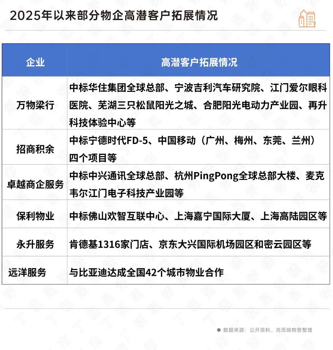 值得注意的是,在當(dāng)前宏觀環(huán)境下,物業(yè)服務(wù)企業(yè)聚焦TMT、高端制造、能源電力、銀行金融、生物醫(yī)藥等“新動(dòng)能”領(lǐng)域,將其作為核心拓展方向。2025年以來(lái),頭部企業(yè)拓展成效顯著,如萬(wàn)物梁行中標(biāo)華住集團(tuán)全球總部、寧波吉利汽車(chē)研究院,卓越商企服務(wù)斬獲中興通訊全球總部等。