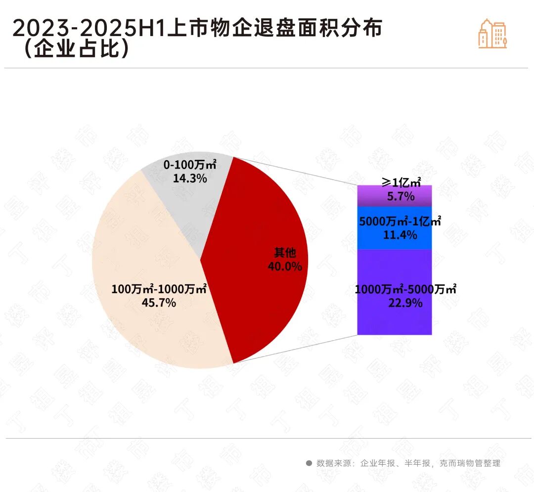從上市物企近年退盤(pán)數(shù)據(jù)來(lái)看,戰(zhàn)略收縮與結(jié)構(gòu)優(yōu)化已成為行業(yè)普遍趨勢(shì)。2023年至2025年中期,35家上市物業(yè)服務(wù)企業(yè)累計(jì)退出管理面積超8億平方米,其中四成企業(yè)退盤(pán)面積超過(guò)千萬(wàn)平方米。彩生活、世茂服務(wù)退盤(pán)規(guī)模居前,近三年累計(jì)退出合約管理面積分別達(dá)1.5億平方米和1.3億平方米。