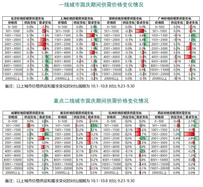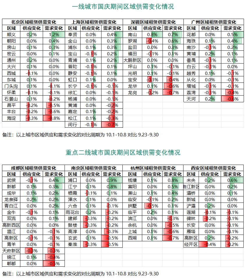 對比國慶假期前后區(qū)域租賃供需,整體新增供應格局變化小,但各城市區(qū)域間需求熱度分化。