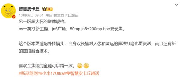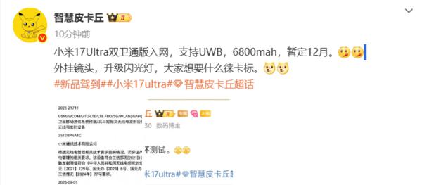 【CNMO 科技消息】CNMO 留意到,10 月 11 日,有博主發(fā)文表示,小米 17 Ultra 雙衛(wèi)通版已入網(wǎng)。該機(jī)型會支持 UWB 超寬帶技術(shù),內(nèi)置一塊 6800mAh 的電池,還會提供外掛鏡頭和升級閃光燈,預(yù)計(jì)在今年 12 月發(fā)布。