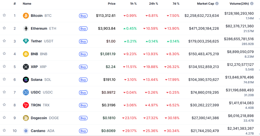 10月11日凌晨,加密貨幣市場遭遇集體暴跌的慘烈局面。比特幣價(jià)格大幅下挫,一度跌超13%,失守11萬美元關(guān)口,最新報(bào)價(jià)為113700美元/枚。