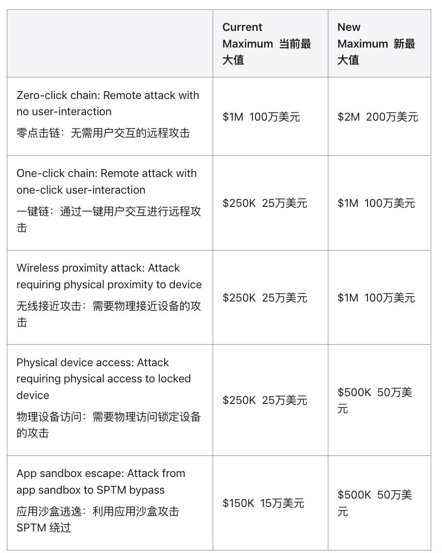 此次升級安全賞金計劃,蘋果將最高基礎(chǔ)獎金一下翻倍至200萬美元,足見其對自身安全系統(tǒng)的重視。不僅如此,蘋果還在基礎(chǔ)獎金上進(jìn)一步加碼,為發(fā)現(xiàn)繞過鎖定模式和測試版軟件的漏洞提供額外獎金,這使得最高金額能達(dá)到500萬美元。