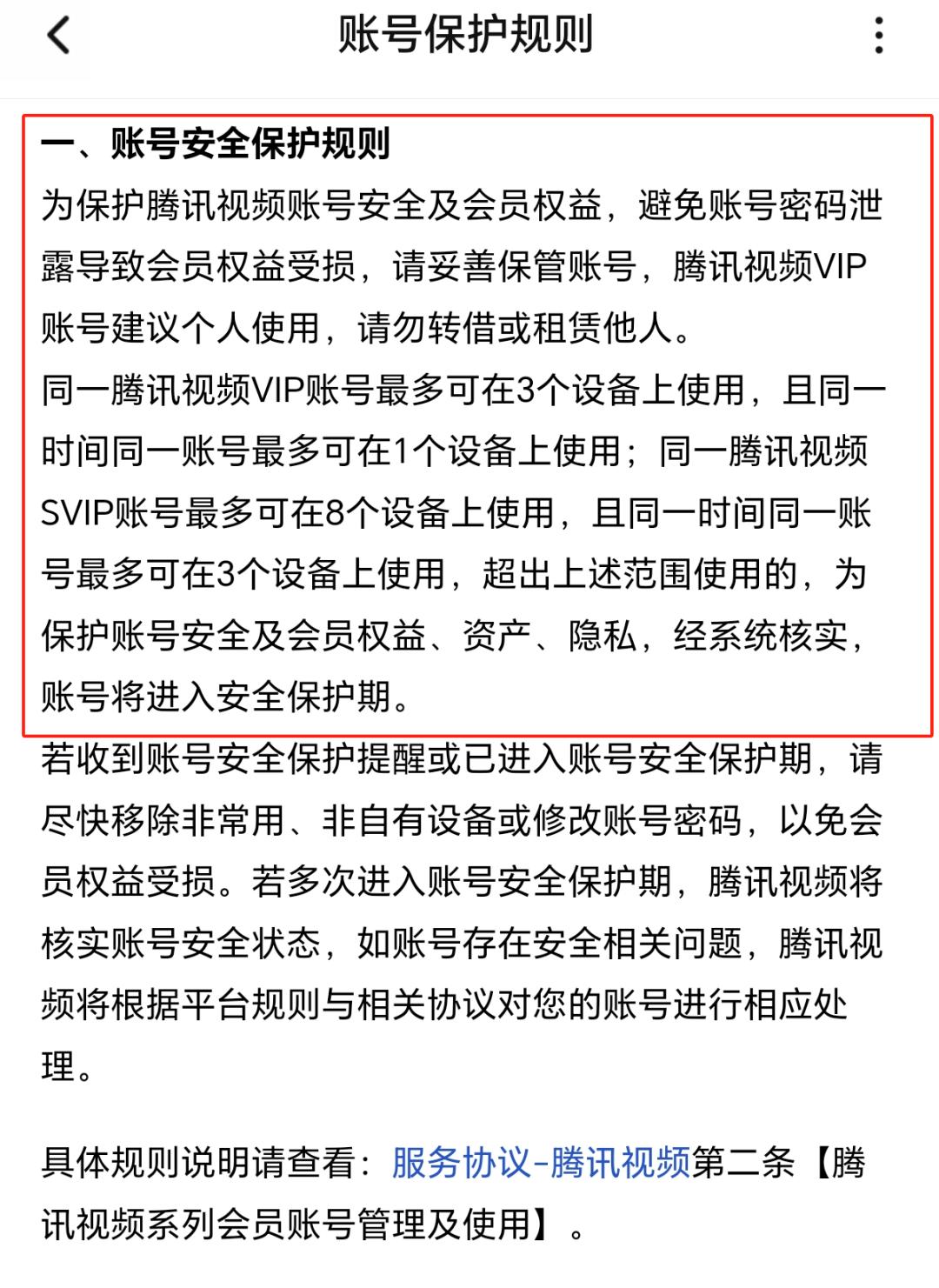 在騰訊視頻App“登錄設(shè)備管理”的頁(yè)面中,記者注意到,騰訊視頻VIP賬號(hào)最多支持3臺(tái)設(shè)備登錄,僅允許1臺(tái)設(shè)備同時(shí)播放;SVIP會(huì)員則可登錄8臺(tái)設(shè)備,并允許3臺(tái)設(shè)備同時(shí)進(jìn)行播放;家庭卡會(huì)員則可登錄10臺(tái)設(shè)備,允許4臺(tái)設(shè)備同時(shí)播放。該平臺(tái)賬號(hào)安全保護(hù)規(guī)則指出,超出上述范圍使用的,為保護(hù)賬戶安全及會(huì)員權(quán)益、資產(chǎn)、隱私,經(jīng)系統(tǒng)核實(shí),賬號(hào)將進(jìn)入安全保護(hù)期。