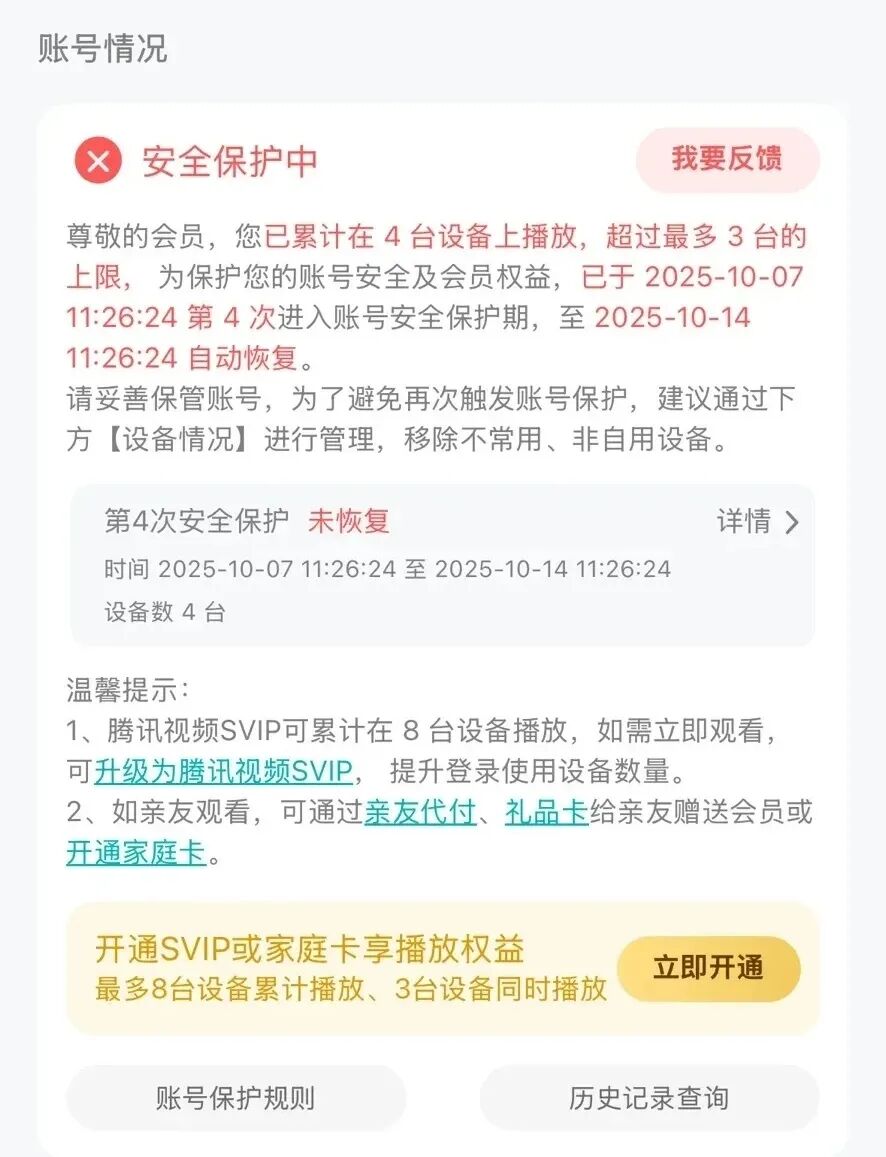 來(lái)自陜西的趙志偉(化名)因封號(hào)和騰訊視頻的客服“拉扯”了許久。他有2部常用手機(jī),1臺(tái)筆記本電腦和iPad。10月7日中午,他使用iPad播放視頻,沒過(guò)多久便收到進(jìn)入安全保護(hù)期的提示。于是,趙志偉第一時(shí)間將多余的設(shè)備退出,只保留3臺(tái),但仍未改變現(xiàn)狀。其提供的截圖同樣顯示:累計(jì)在4臺(tái)設(shè)備上播放,第五次超限,賬號(hào)進(jìn)入安全保護(hù)期。