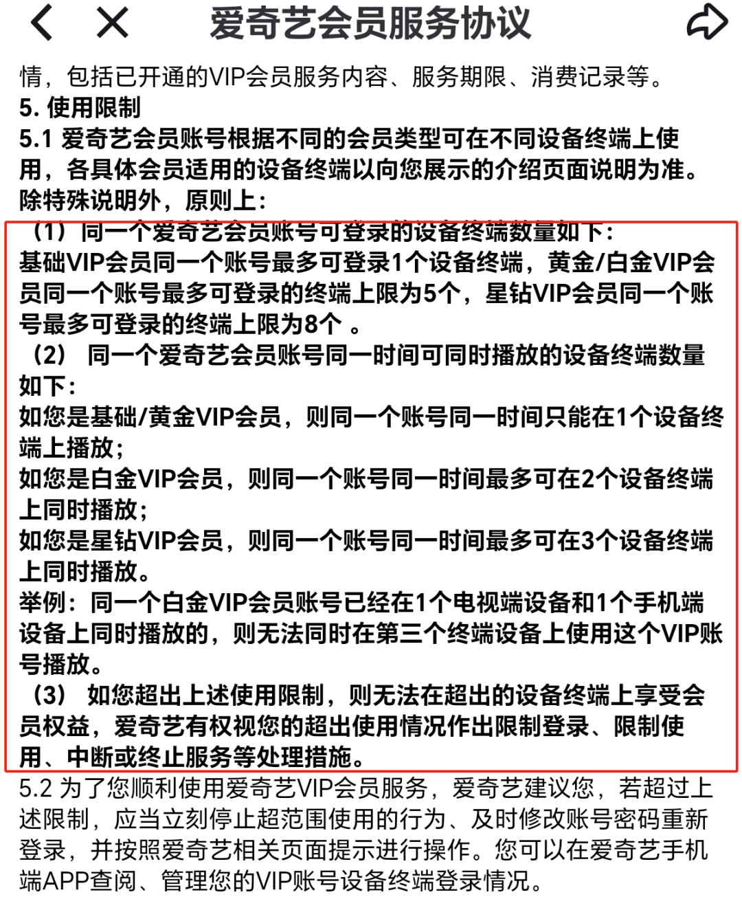 愛奇藝則規(guī)定,基礎(chǔ)VIP會(huì)員最多可登錄1個(gè)設(shè)備終端,黃金/白金VIP會(huì)員最多可登錄的終端上限為5個(gè),星鉆VIP最多可登錄8個(gè)。