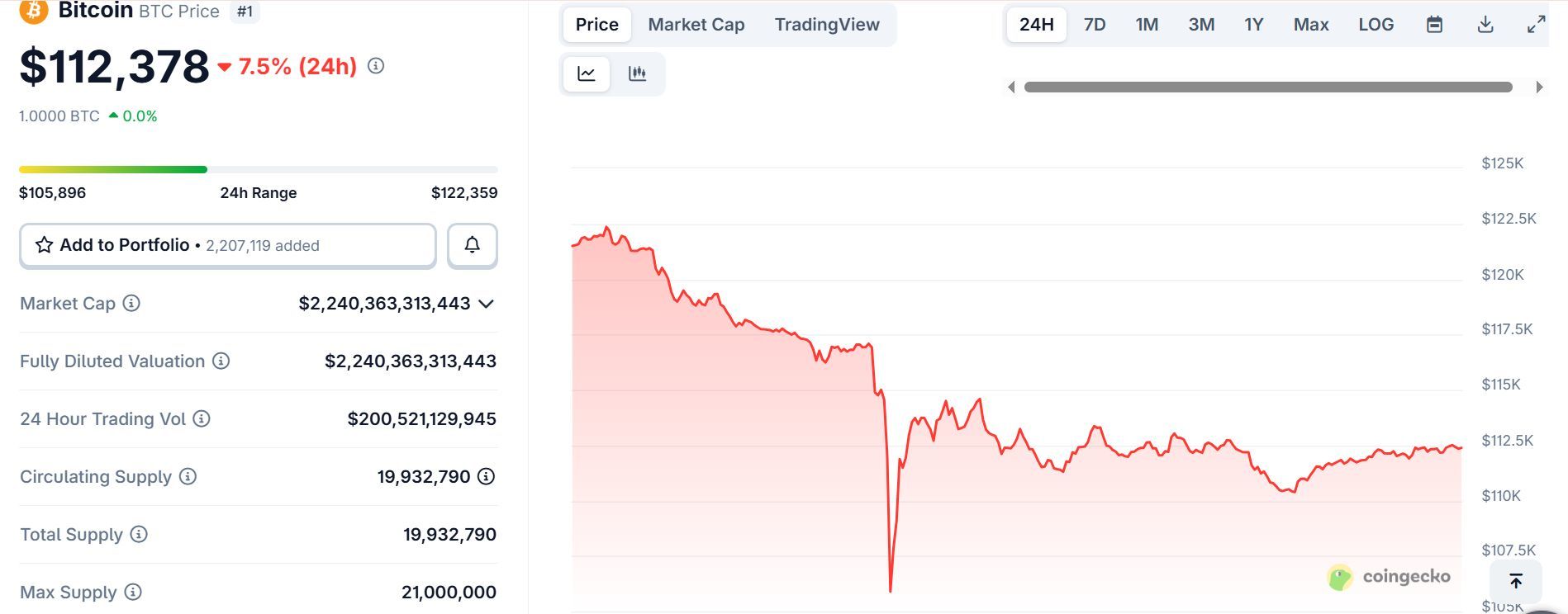 10日晚間,比特幣價(jià)格從約11.7萬美元高位急速跌破11萬美元關(guān)口,一度狂瀉超1萬美元。截至11日清晨,比特幣24小時(shí)內(nèi)跌幅達(dá)13.5%,最低觸及10.593萬美元。