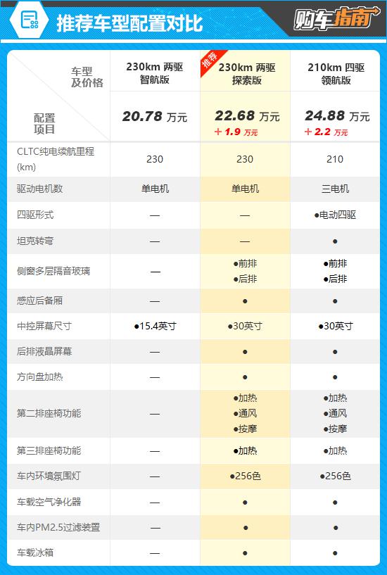 售價(jià)22.68萬(wàn)元的230km兩驅(qū)探索版是推薦車型。配置對(duì)比顯示,該車型比低一版增加感應(yīng)后備廂、方向盤加熱、第二排座椅加熱/通風(fēng)/按摩、車載冰箱等實(shí)用功能,用車體驗(yàn)顯著提升。還配備30英寸一體式雙聯(lián)屏和后排液晶屏幕,更貼合消費(fèi)者用車需求。售價(jià)僅比低一版多19000元,物有所值,性價(jià)比出色。