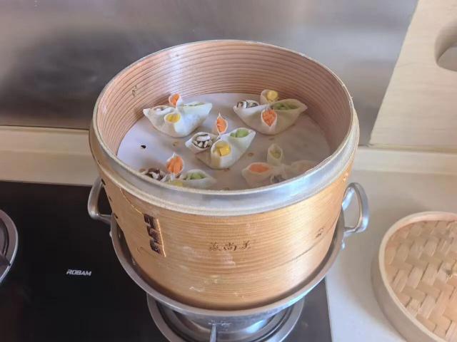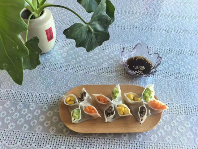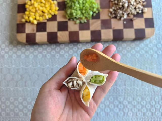 4. 往花瓣狀的餃子里填入胡蘿卜碎、香菇碎、玉米粒、芹菜碎。