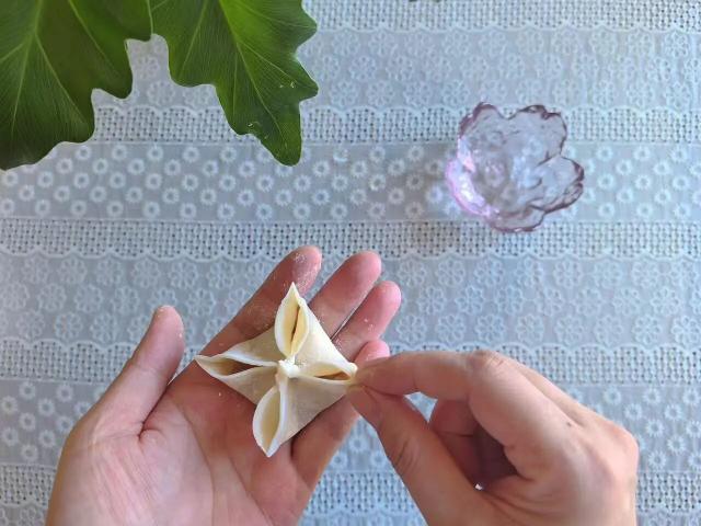3. 沾水后將餃子皮對折,捏緊中間,再捏緊另外兩邊,把4個孔挨個捏緊,使其成為花瓣狀。