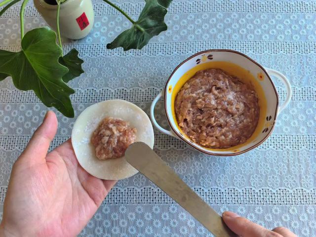 1. 在豬肉餡中加入蔥姜花椒水,順著一個方向攪拌,直到完全吸收,接著加入料酒、生抽、蠔油、雞精、少量的鹽、胡椒粉、香油,攪拌均勻。