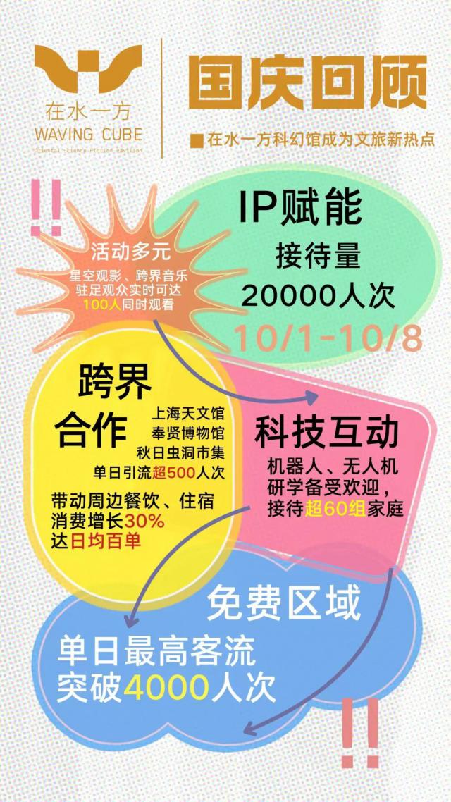 2025年國(guó)慶,位于上海奉賢金海湖畔的在水一方科幻館以科幻為核心,融合科技、藝術(shù)、科普、研學(xué)等多種元素,打造了兼具知識(shí)性與趣味性的假期。它成功點(diǎn)燃市民游客的打卡熱情,助力奉賢區(qū)域文旅知名度躍升與消費(fèi)增長(zhǎng),成為滬上文旅新亮點(diǎn)。雙節(jié)假期,在水一方科幻館接待量達(dá)2萬(wàn)人次,進(jìn)入收費(fèi)區(qū)3500人次,帶動(dòng)周邊餐飲、住宿消費(fèi)增長(zhǎng)30%,達(dá)日均百單。