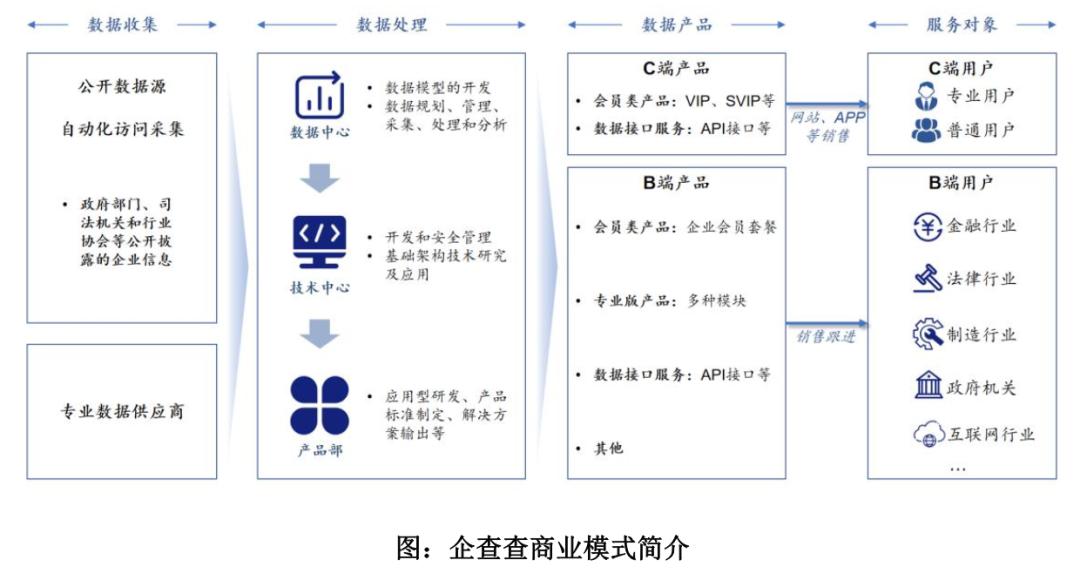 企查查以各地各級(jí)政府部門、司法機(jī)關(guān)、行業(yè)協(xié)會(huì)等依法公示的公開信息為主要基礎(chǔ)原料,對(duì)海量互聯(lián)網(wǎng)數(shù)據(jù)源的商業(yè)大數(shù)據(jù)進(jìn)行收集、清洗、標(biāo)注、挖掘和分析,利用人工智能、大數(shù)據(jù)挖掘、可視化分析等技術(shù)手段進(jìn)行深度的結(jié)構(gòu)化、標(biāo)簽化處理,將有關(guān)聯(lián)關(guān)系的離散數(shù)據(jù)建立聯(lián)系,并基于對(duì)用戶應(yīng)用場(chǎng)景的理解,形成主要面向個(gè)人用戶的會(huì)員類產(chǎn)品,和主要面向企業(yè)級(jí)用戶的企查查專業(yè)版、數(shù)據(jù)接口服務(wù)等產(chǎn)品或服務(wù)。