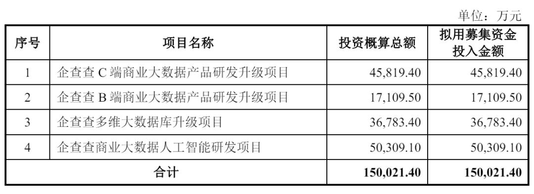 企查查計(jì)劃募資15億元,其中,4.58億元用于企查查C端商業(yè)大數(shù)據(jù)產(chǎn)品研發(fā)升級(jí)項(xiàng)目,1.71億元用于B端商業(yè)大數(shù)據(jù)產(chǎn)品研發(fā)升級(jí)項(xiàng)目,3.68億元用于多維大數(shù)據(jù)庫(kù)升級(jí)項(xiàng)目,5億元用于商業(yè)大數(shù)據(jù)人工智能研發(fā)項(xiàng)目。
