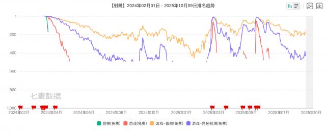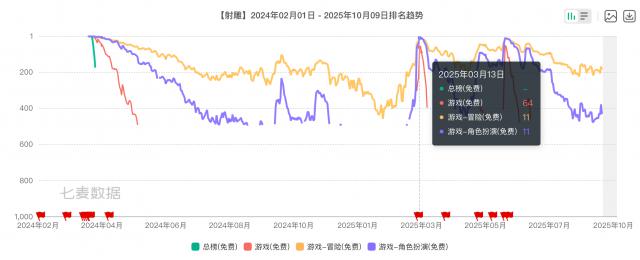 從排名趨勢來看,游戲基本處于起起落落的狀態(tài),偶爾有短暫的高光時(shí)刻,但大部分時(shí)間排名都很靠后,只能說是參與了一下。