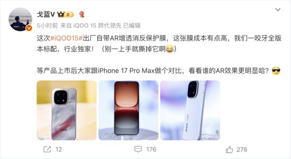【CNMO 科技新聞】10 月 20 日,iQOO 即將舉辦新品發(fā)布會(huì),正式推出全新的 iQOO 15 系列手機(jī)。在產(chǎn)品正式發(fā)布前,有關(guān)該產(chǎn)品的各類消息也在陸續(xù)公布。近日,iQOO 產(chǎn)品經(jīng)理 @戈藍(lán) V 在社交媒體透露,這次 iQOO 15 出廠將自帶 AR 增透消反保護(hù)膜。