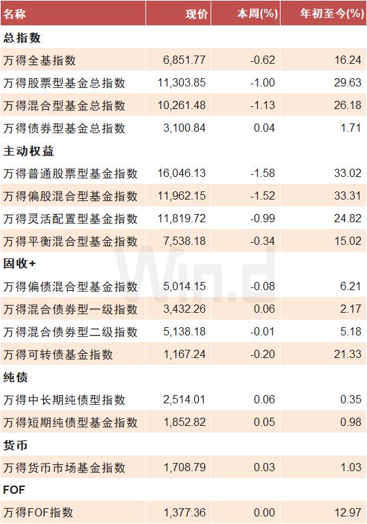 最近一周,萬得基金指數(shù)整體偏弱。萬得全基指數(shù)跌0.62%;萬得股票型基金總指數(shù)跌1.00%;萬得混合型基金總指數(shù)跌1.13%;萬得普通股票型基金指數(shù)跌1.58%;萬得偏股混合型基金指數(shù)跌1.52%;萬得靈活配置型基金指數(shù)跌0.99%。