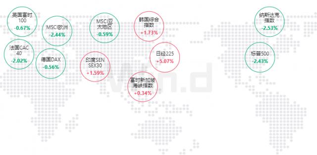 美國市場:道瓊斯工業(yè)指數(shù)、納斯達(dá)克指數(shù)、標(biāo)普500指數(shù)全線下跌,累計(jì)跌幅分別為2.73%、2.53%、2.43%。
