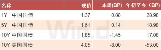 最近一周,國債收益率表現(xiàn)分化。1年期中國國債收益率升0.88個(gè)基點(diǎn)至1.37%,5年期升0.14個(gè)基點(diǎn)至1.61%,10年期降1.45個(gè)基點(diǎn)至1.85%。10年期美國國債收益率降8.00個(gè)基點(diǎn)至4.05%。