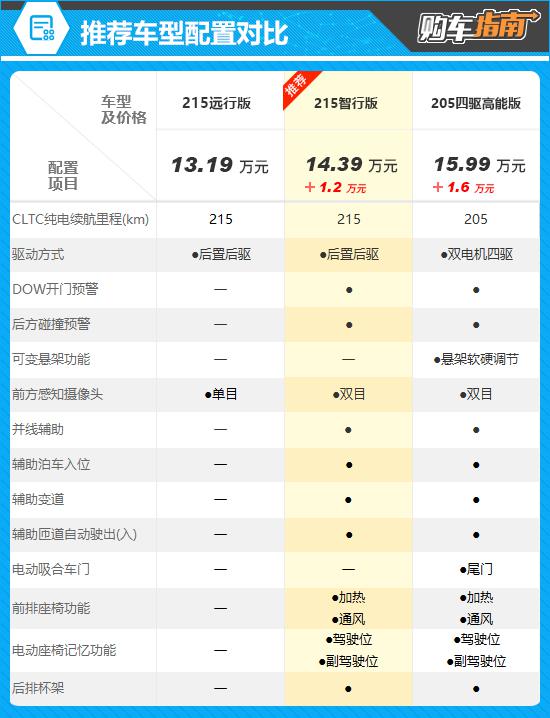 頂配車型相比推薦車型主要在性能方面有提升,采用雙電機(jī)四驅(qū),提供懸架軟硬調(diào)節(jié)和電動(dòng)吸合尾門。但對(duì)于一款主要用于城市通勤的緊湊型SUV來說,頂配車型新增的配置并非剛需,且CLTC純電續(xù)航里程減少了10km,為此多花1.6萬元不太劃算。