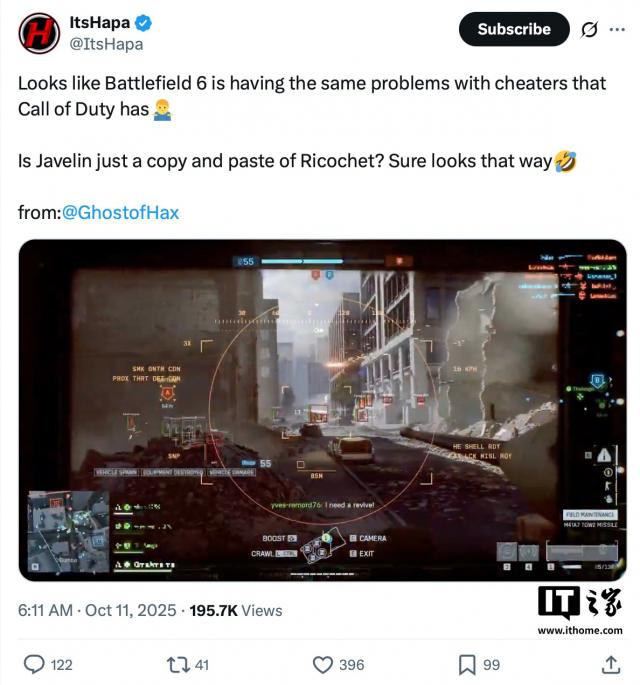 IT 之家 10 月 12 日消息,繼上周《使命召喚:黑色行動 7》測試版被外掛入侵后,作弊者如今將目標轉(zhuǎn)向了 EA 于北京時間前天晚上 11 點發(fā)售的《戰(zhàn)地風云 6(Battlefield 6)》,目前這款游戲中已有部分玩家“開掛”作弊。