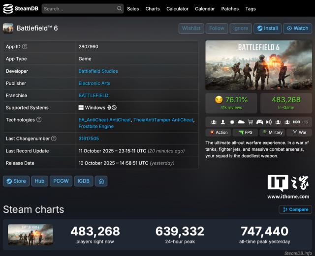 據(jù) SteamDB 顯示,截至 IT 之家發(fā)稿時,《戰(zhàn)地風云 6》在 Steam 平臺的玩家同時在線量為 48 萬人(483268 人),目前游戲好評率為 76.11%。至于本作是否會像之前一樣,因外掛泛濫問題而遭到玩家吐槽,還有待進一步觀察。