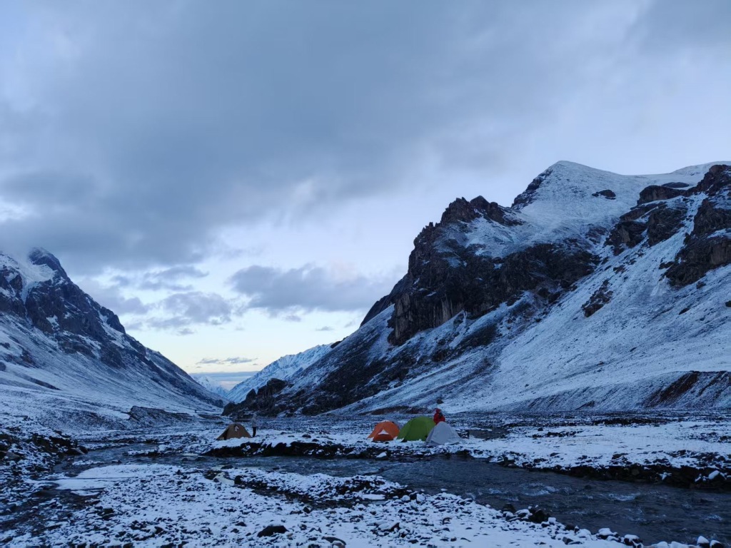 10月4日雪停后,楊豪和隊(duì)友開(kāi)始徒步。團(tuán)隊(duì)共5人,帶了沖泡米飯、肉干和零食。進(jìn)山當(dāng)天天氣晴朗,他們翻越4200米埡口,前半段艷陽(yáng)高照,后半段烏云密布、大風(fēng)呼嘯,人易失溫。之后下行至河谷繼續(xù)穿越,白天氣溫15度左右,晚上下雪后降至零下5度左右。翻越埡口前,遇到下撤隊(duì)伍,對(duì)方擔(dān)心下雪出事故。