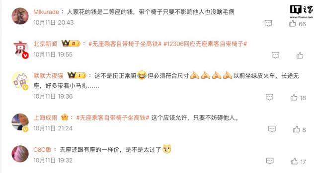 這一回應又引發(fā)了網(wǎng)友的進一步討論。有網(wǎng)友質(zhì)疑無座票和二等座/硬座票價相同是否合理,還有網(wǎng)友擔心會有旅客不遵守椅子具體尺寸的攜帶規(guī)定。