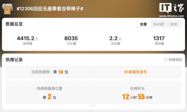 IT之家10月12日消息,2025年國慶中秋假期結(jié)束,迎來了返程高峰。多地熱門鐵路車次的座位票全部售罄,于是不少乘客想出了自帶椅子乘車的辦法。有網(wǎng)友發(fā)文并配圖,稱自己買了高鐵無座票后,自帶椅子坐在列車車門旁邊的區(qū)域,還幽默地表示自己當了一回高鐵“守門員”,這一情況引發(fā)了網(wǎng)友的熱烈討論。截至IT之家發(fā)稿,相關話題在微博的閱讀量達到了4337.5萬。