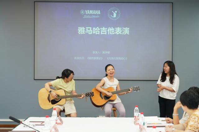 在儀式最后的“吉他教學(xué)互動環(huán)節(jié)”,雅馬哈特邀音樂教師手持捐贈吉他,以一首大家熟悉的歌曲開場。接著,教師從“正確持琴姿勢”“基礎(chǔ)和弦按壓”等入門知識開始,耐心指導(dǎo)大家練習(xí)。不一會兒,學(xué)員們就彈出了完整和弦,并在老師帶領(lǐng)下唱起《萱草花》,溫柔歌聲與清脆吉他聲交織,成為現(xiàn)場最美的風(fēng)景。
