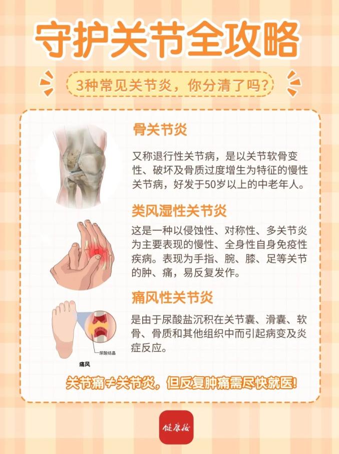 關(guān)節(jié)炎是老年人常見慢性疾病之一,有100多種類型,最常見的是骨關(guān)節(jié)炎、痛風(fēng)性關(guān)節(jié)炎和類風(fēng)濕關(guān)節(jié)炎三種。