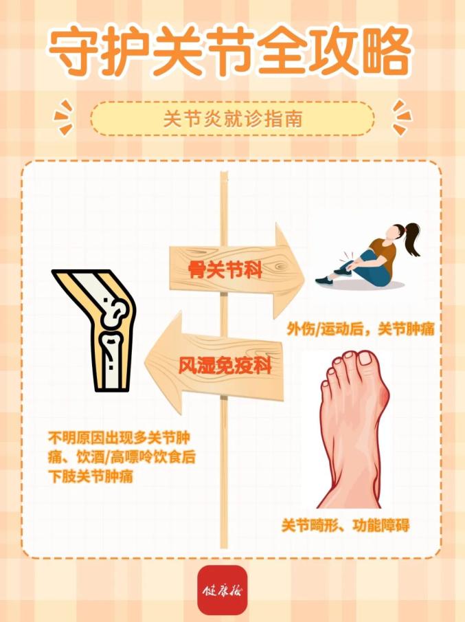 外傷或運(yùn)動(dòng)后關(guān)節(jié)和周圍組織腫痛,優(yōu)先去骨關(guān)節(jié)科就診;不明原因多關(guān)節(jié)腫痛,或飲酒和高嘌呤飲食后下肢關(guān)節(jié)腫痛,去風(fēng)濕免疫科就診;嚴(yán)重關(guān)節(jié)畸形和功能障礙,去骨關(guān)節(jié)科診治,必要時(shí)手術(shù)治療。