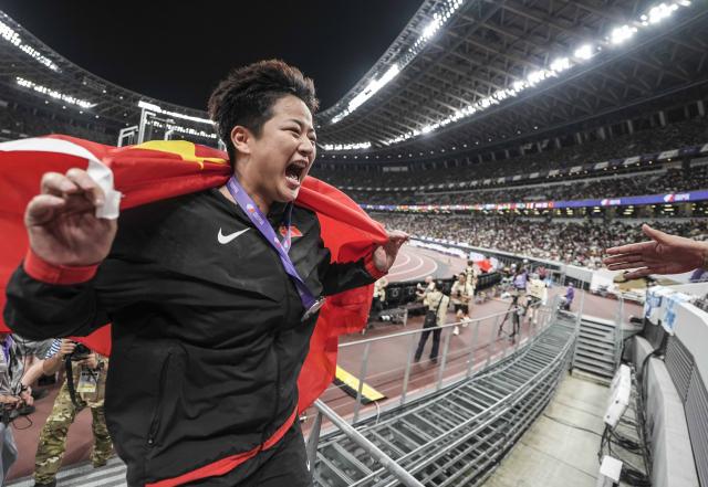 9月14日,中國選手馮彬在2025東京田徑世錦賽女子鐵餅決賽時與場邊教練交流。索尼Alpha 9 III + FE 16 - 35mm F2.8 GM II,魏征 攝