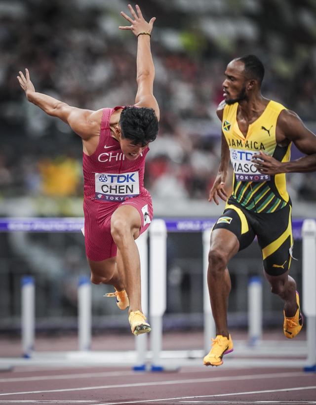9月16日,中國選手陳圓將(左)在2025東京田徑世錦賽男子110米欄半決賽中撞線。索尼Alpha 9 III + FE 400mm F2.8 GM OSS,魏征 攝