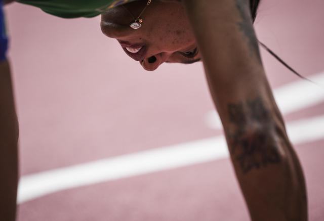 9月12日,距離2025東京田徑世錦賽開幕還有一天。一名選手在國立競技場適應(yīng)場地訓(xùn)練時,悠閑地咀嚼著口香糖。索尼Alpha 9 III + FE 400mm F2.8 GM OSS,魏征 攝