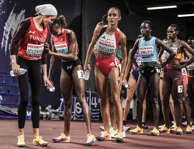 9月17日,突尼斯與巴林選手(左一、二)在2025東京田徑世錦賽女子3000米障礙決賽前相互安慰。索尼Alpha 9 III + FE 70 - 200mm F2.8 GM OSS II,魏征 攝