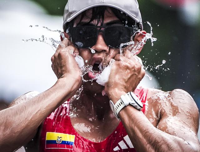 9月13日,厄瓜多爾選手MENA在2025東京田徑世錦賽男子35公里競走決賽中為自己降溫。索尼Alpha 9 III + FE 100 - 400mm F4.5 - 5.6 GM OSS,魏征 攝