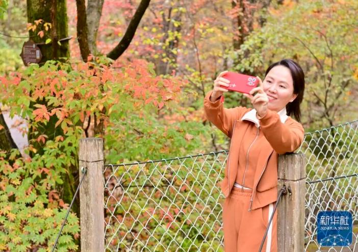 ↑ 10月11日,有游客在天橋溝景區(qū)拍照,記錄美好瞬間。