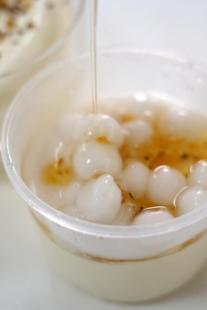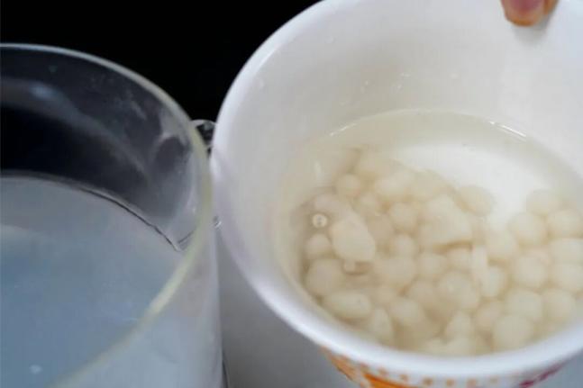 趁著奶凍凝固的時間,煮一鍋小圓子。水開后下入小圓子,輕輕攪動防止粘連,待其浮起后再煮兩分鐘,撈出過涼水,這樣口感會更彈。