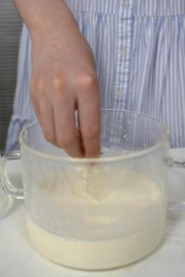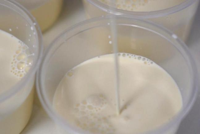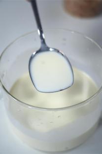 把吉利丁片放入冷水中浸泡,待其變軟后擠干水分。奶液關(guān)火,等溫度降至50℃時,將泡軟的吉利丁片加入溫熱的奶液中,攪拌至完全溶解,確?;旌暇鶆?。接著將混合液倒入杯中,冷卻至室溫后,放入冰箱冷藏2小時以上,直至凝固。