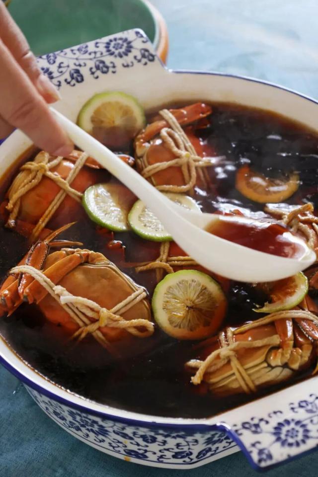 煮好的螃蟹撈出,放入冷卻的鹵汁,確保完全沒過螃蟹,撒少許檸檬片,再放入冰箱冷藏 6 - 8 小時,讓螃蟹充分吸收鹵汁的酒香和香料味即可。