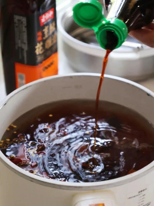 鍋中倒入適量清水,放入桂皮、陳皮、花椒、八角、干辣椒、生姜片、話梅、冰糖,大火煮開后轉小火煮 10 分鐘,讓香料味道充分釋放,隨后加入生抽、花雕酒,攪拌均勻后關火放涼,鹵汁就做好了。