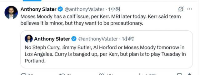 勇士隊(duì)記斯萊特發(fā)文稱,據(jù)主教練科爾透露,庫里目前有輕微傷病,但計(jì)劃出戰(zhàn)周三(北京時(shí)間)對(duì)陣開拓者隊(duì)的比賽。另外,穆迪存在小腿問題,球隊(duì)認(rèn)為傷勢(shì)并不嚴(yán)重,他將接受核磁共振檢查。